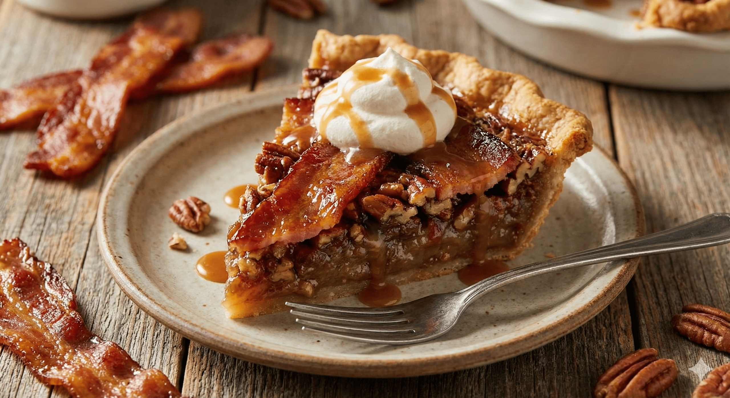 Three strips of bacon candied with brown sugar, pecans and pie seasonings