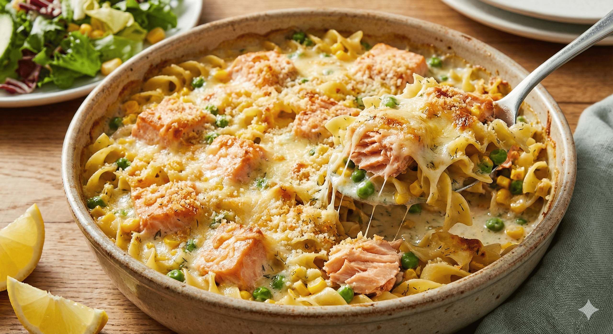 House Smoked salmon, old fashion egg noodles, baked in a roasted garlic Parmesan bechamel